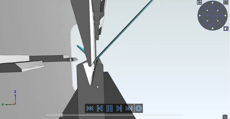 Kollisionen und Rüstprobleme vermeiden: Dank fortschrittlicher 3D‑Simulation prüft Almacam Bend jeden Schritt des Abkantprozesses und kontrolliert Zugänglichkeit, Werkzeuginteraktionen und Kollisionsrisiken, bevor der Biegeprozess startet.