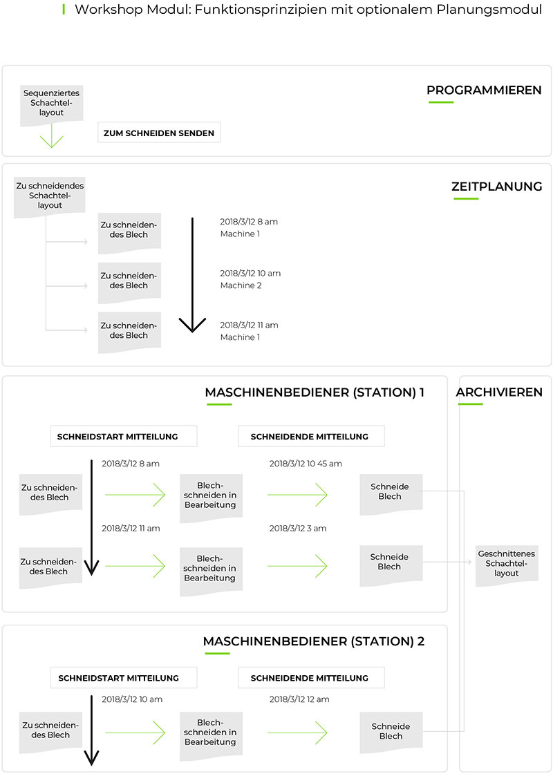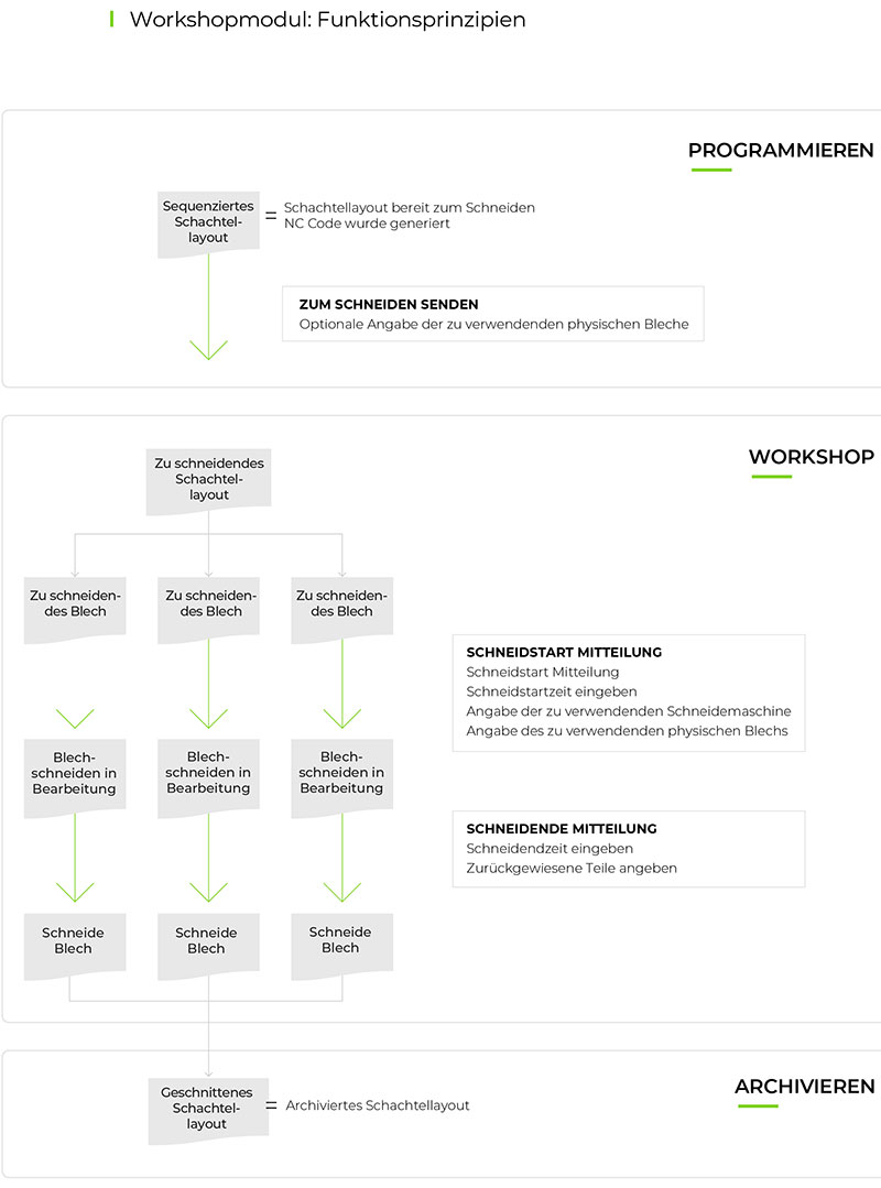 Sofern der Werkstattleiter die zu schneidenden Bleche mit dem Scheduler geplant hat, erhalten sie außerdem die Planung der Programme, die gestartet werden müssen, einschließlich der vorgesehenen Startzeitpunkte für den Schneidprozess.